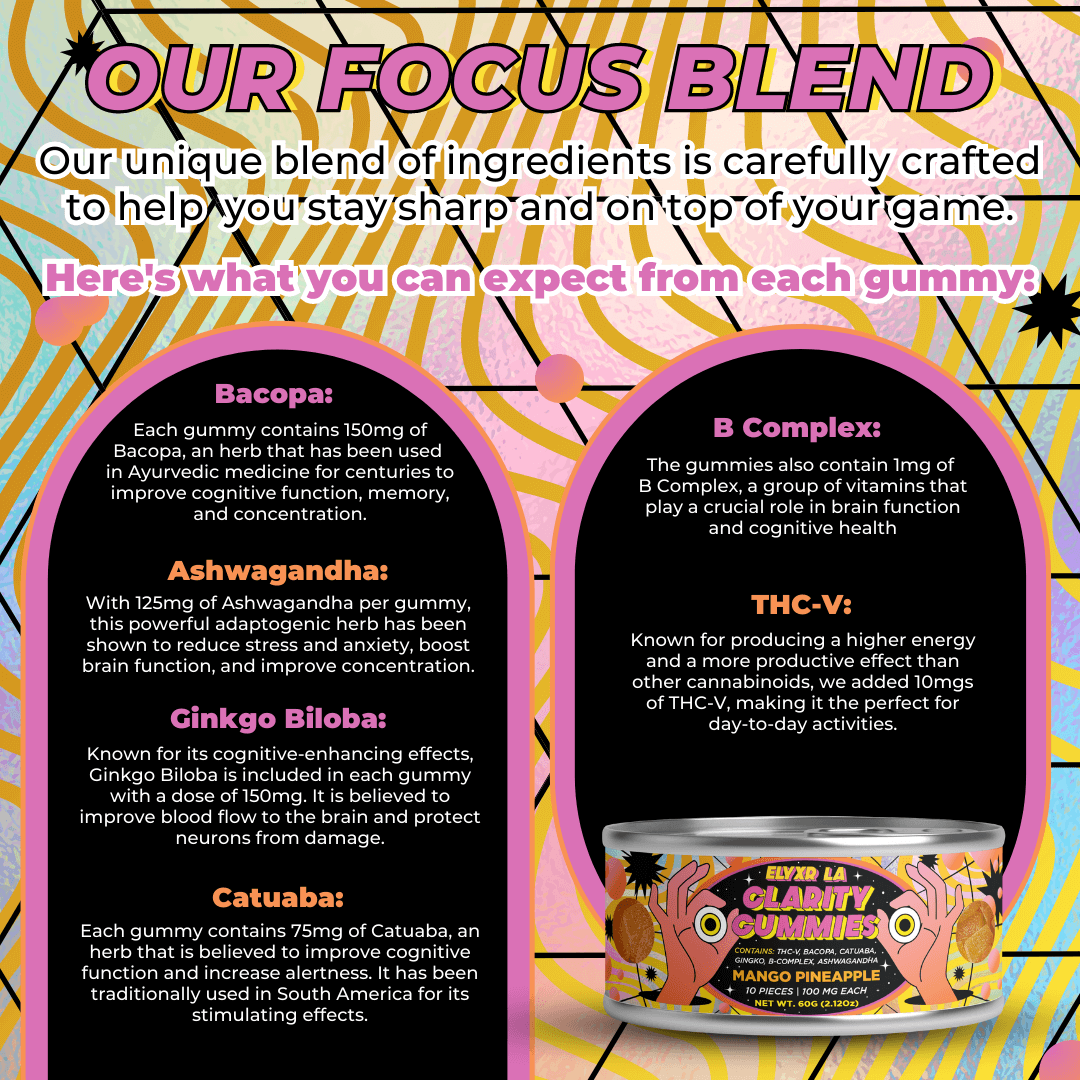 If you're looking for an alternative way to stay focused and productive throughout the day, then Elyxr’s Center of Attention gummies are the perfect solution. We are not making the claim that these gummies are like the Limitless pill Bradley Cooper takes to become his prime self, they have been shown to help: