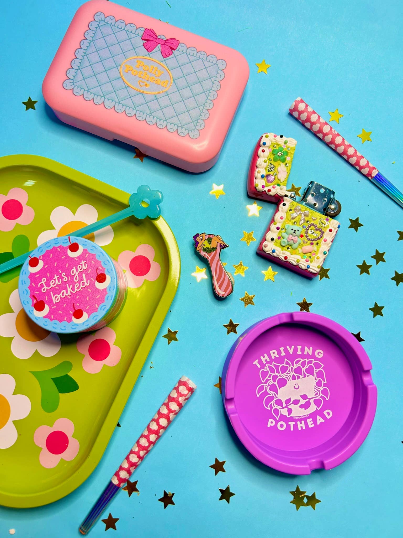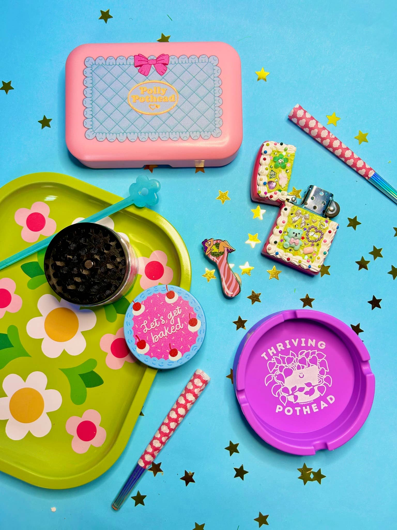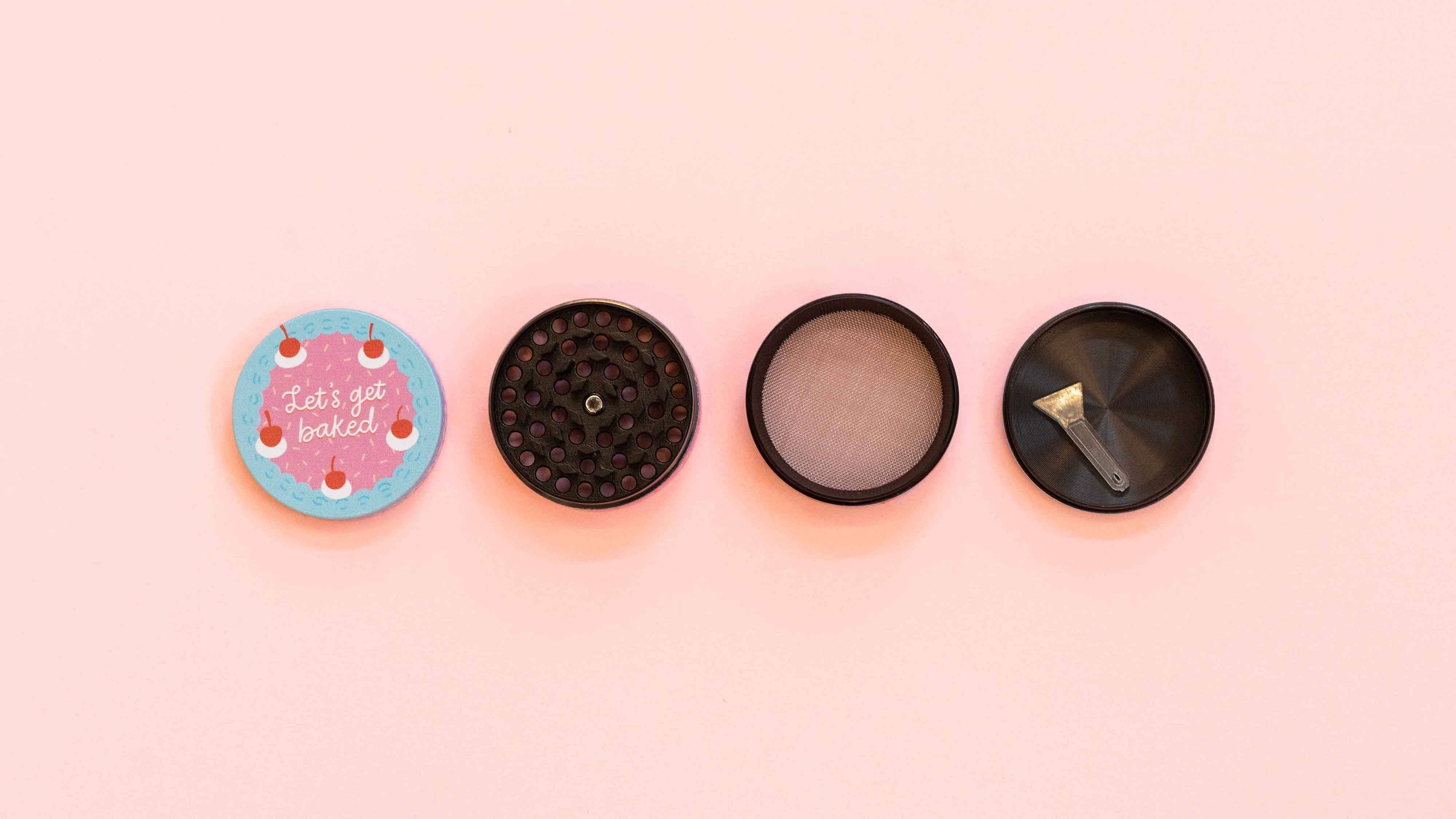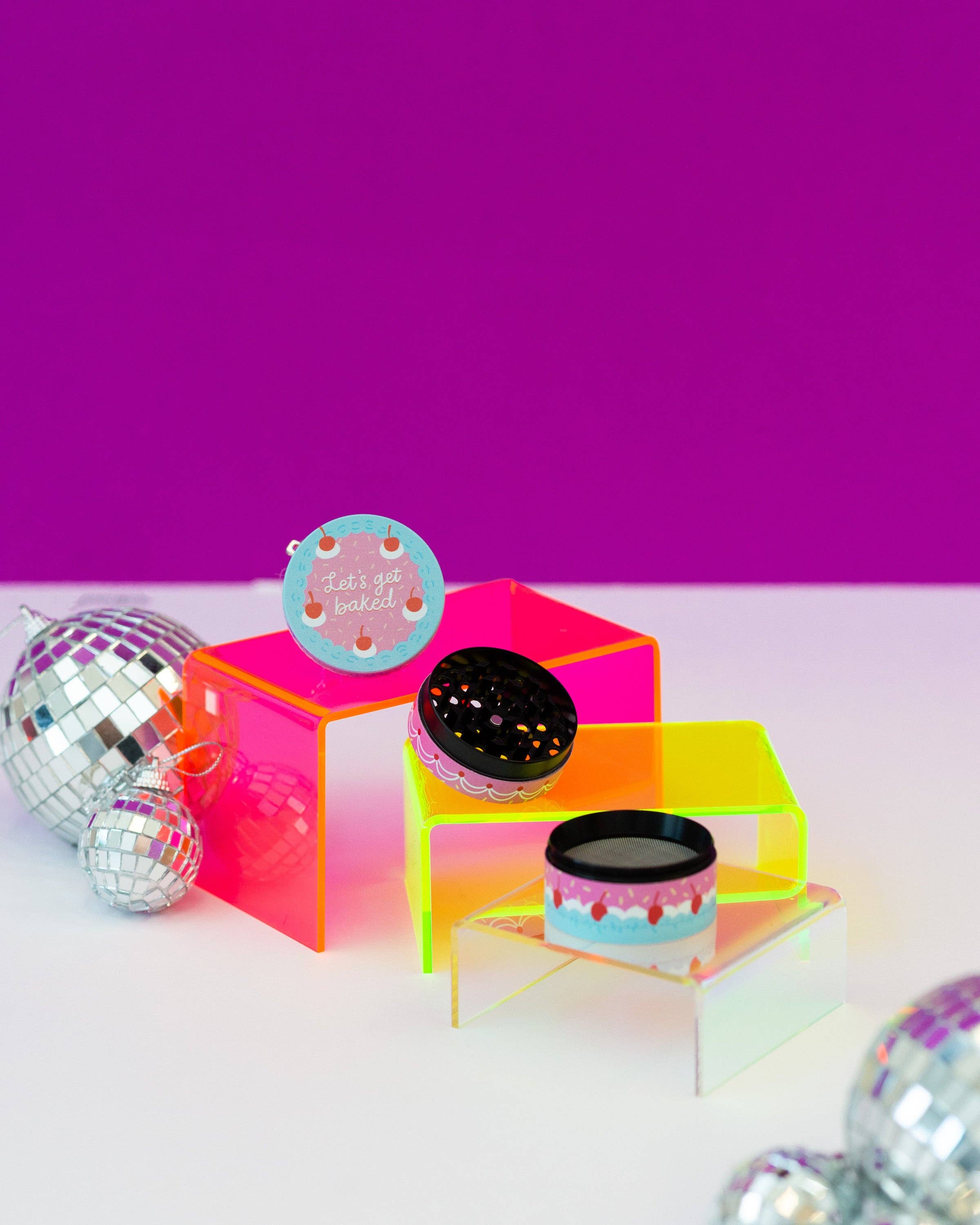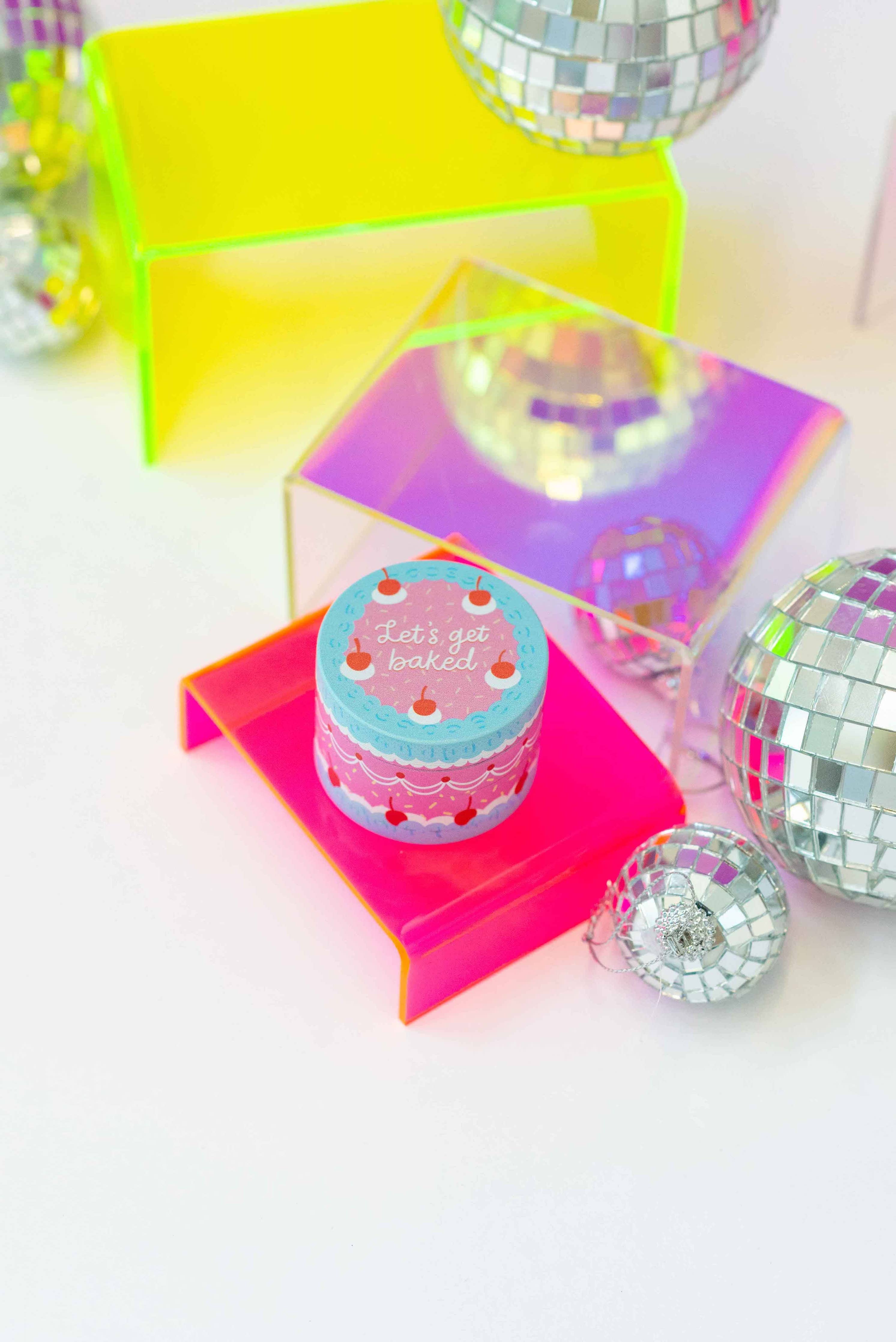 Be the life of the party with the *Fake* Fake Cake Grinder! It is baked-to-perfection with a round cake design on all sides - complete with cherries and sprinkles - and "Let's get baked" as the literal icing on top.