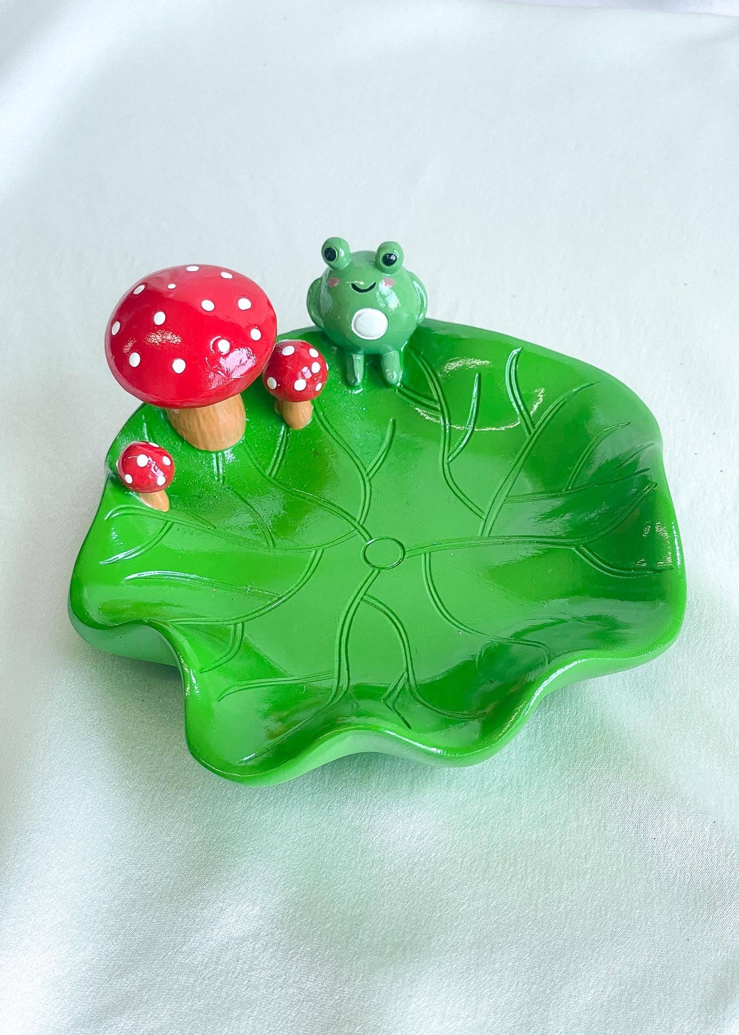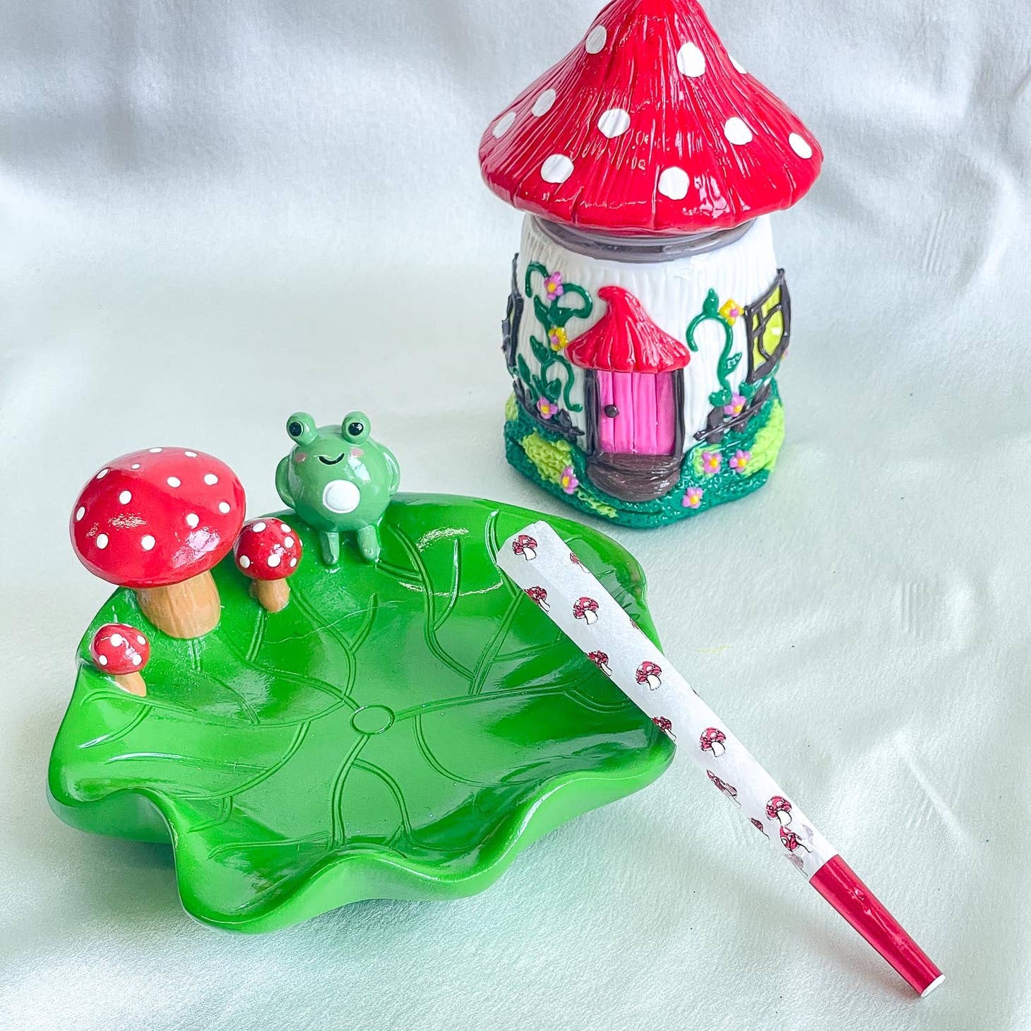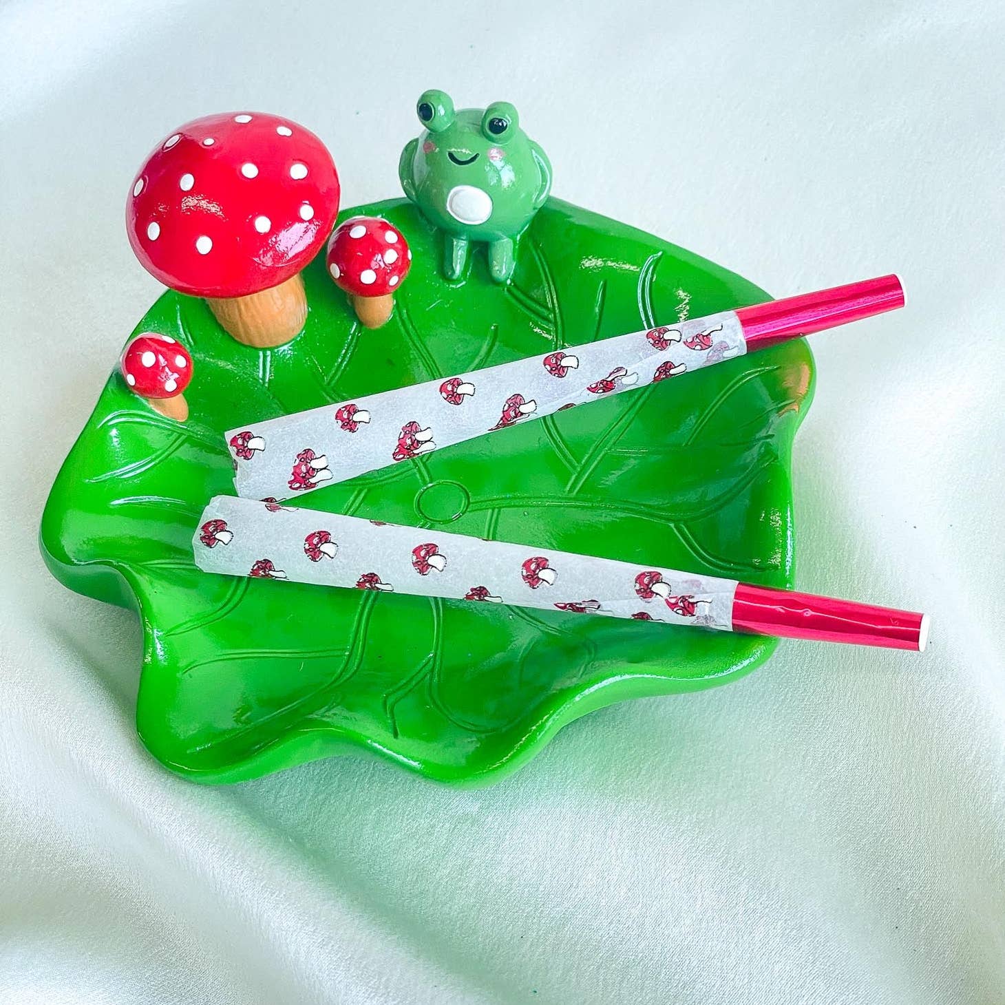 Perch your joint next to the best smoke sesh buddy - a cute little blushing frog! Your hand painted amphibian friend sits on a lush green lily pad next to a trio of red mushrooms. The curled edges of the lily pad make for the perfect resting spot for your joints.