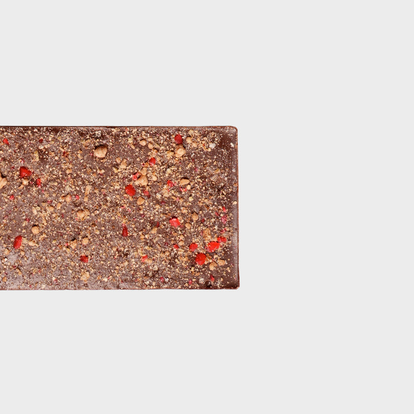 Our Strawberry Milk bar features creamy white chocolate with bursts of vibrant strawberry flavor, adorned with dehydrated strawberries and crushed cereal pieces, a creamy and crunchy delight.
