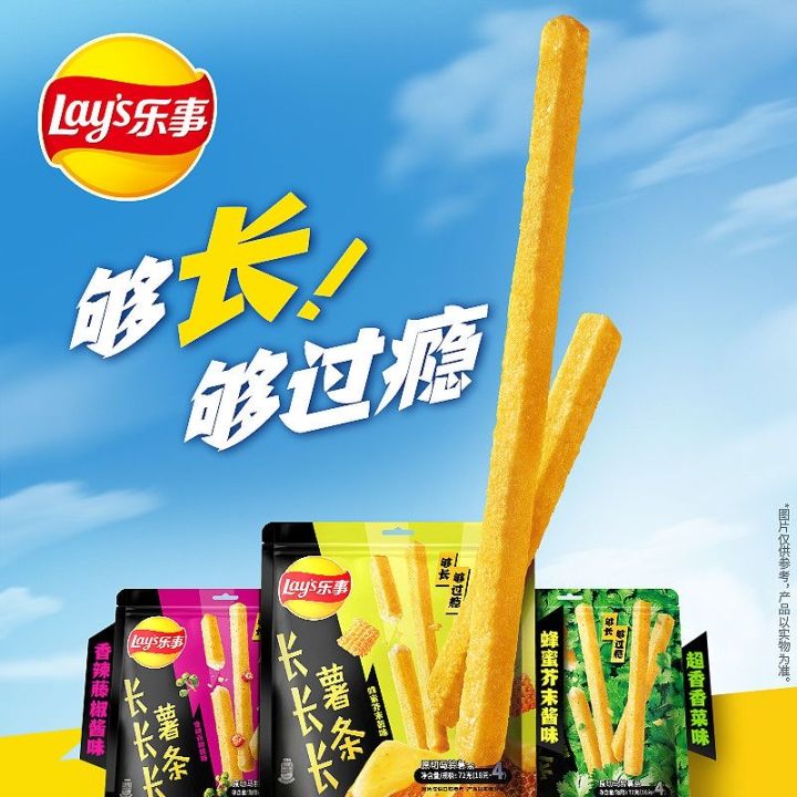 Experience a flavor explosion with Lays Long Fries in tangy honey mustard! These uniquely shaped chips, imported from Asia, are a mouthful of deliciousness. Don't miss out on trying this quirky twist on the classic Lay's chips.