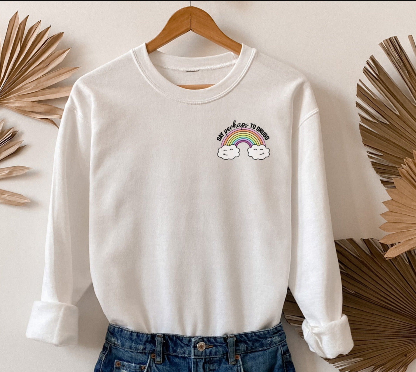 Don't miss this sassy statement piece! You'll look bold in this Say Perhaps To Drugs Crewneck. Made of comforting white cotton, the design features a rainbow of colors that will get you noticed, and inspire others to make good choices! Let's get outta here and shine!