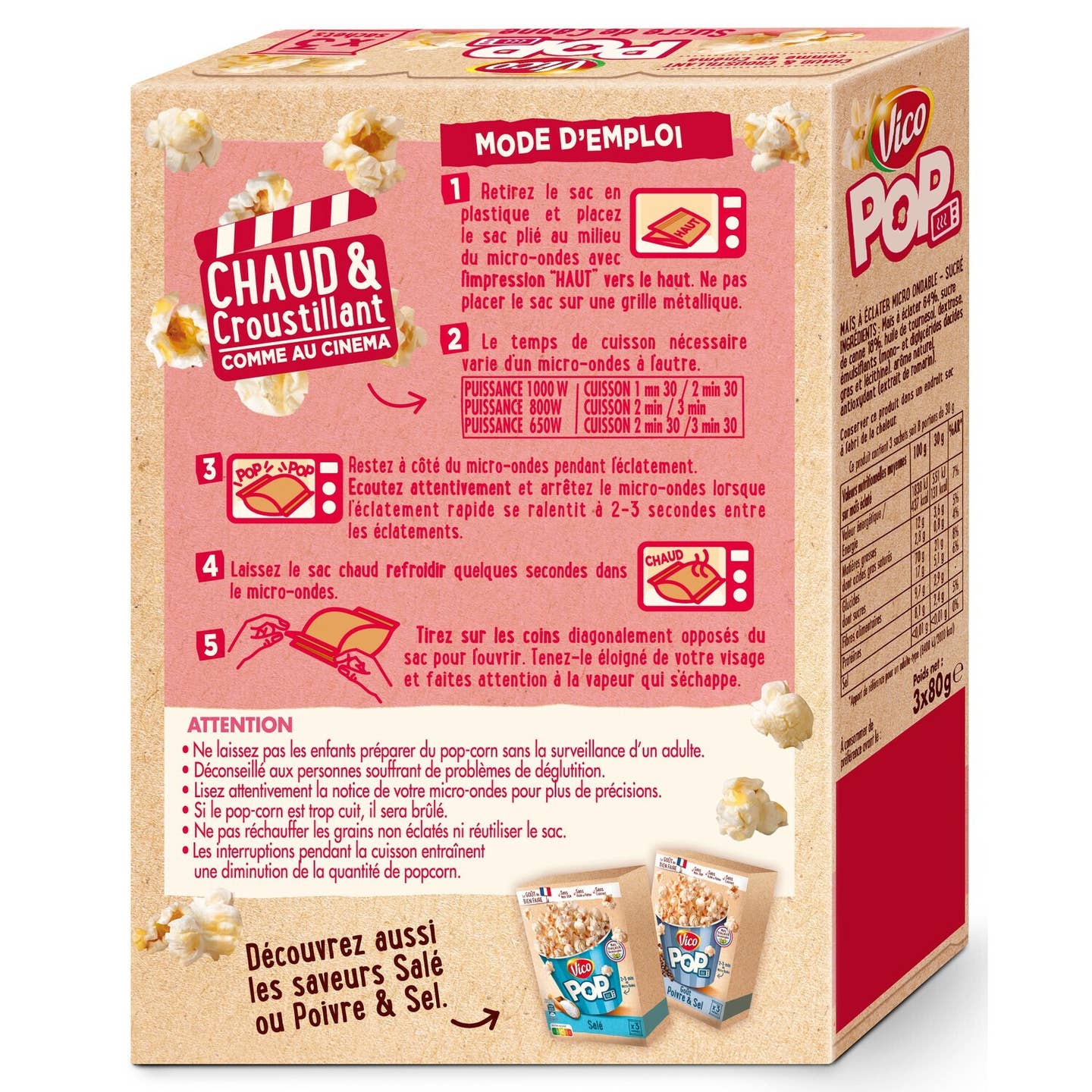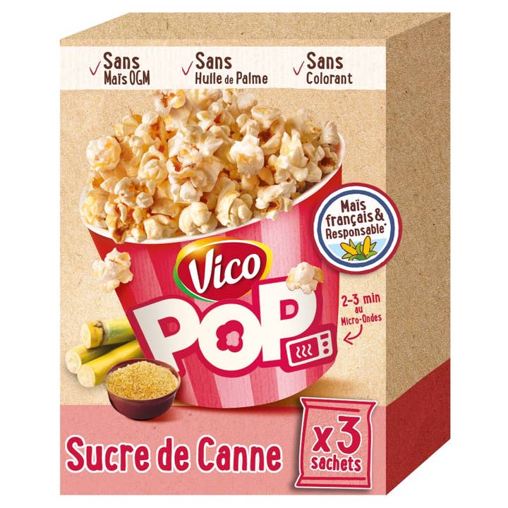 Enjoy Vico Pop, a delicious microwaveable popcorn made with French corn and GMO-free! A tasty recipe with cane sugar, to be enjoyed hot and crispy, just like in the movies! Carton of 16 boxes of 3 sachets.