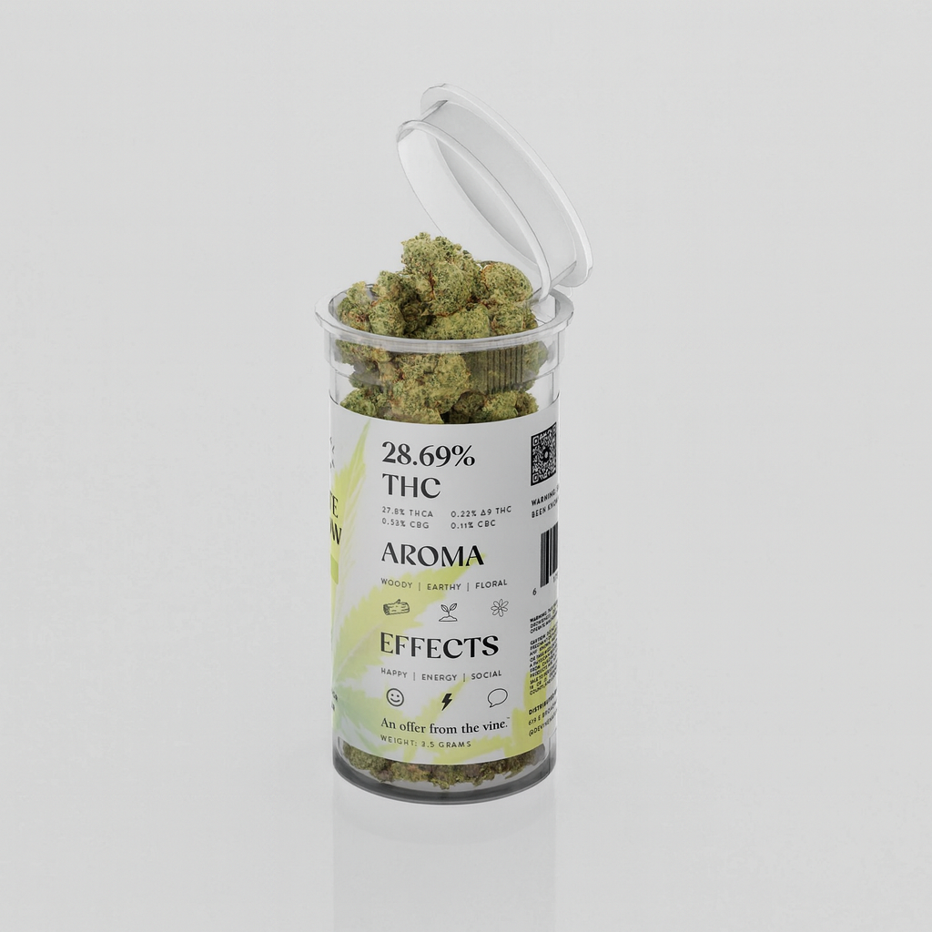 Each bud is cloaked in a frosted veil of trichomes, giving this cultivar its iconic name and warning of the potency within. With 28.69% total THC and 27.8% THC-A, White Widow delivers a powerful, euphoric lift — sparking creativity, fueling conversation, and energizing the senses.