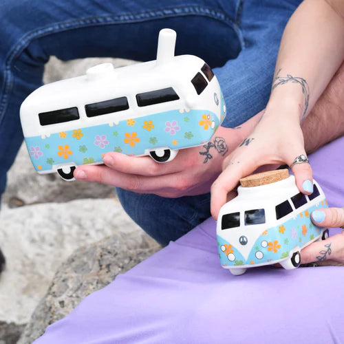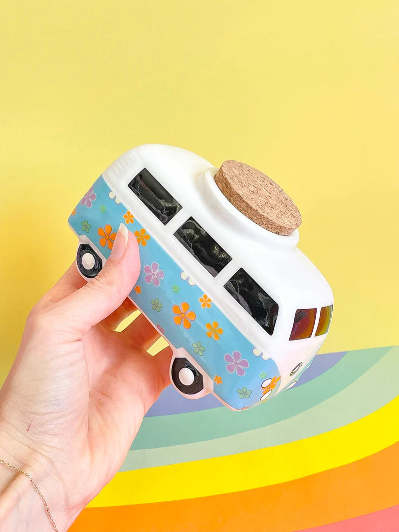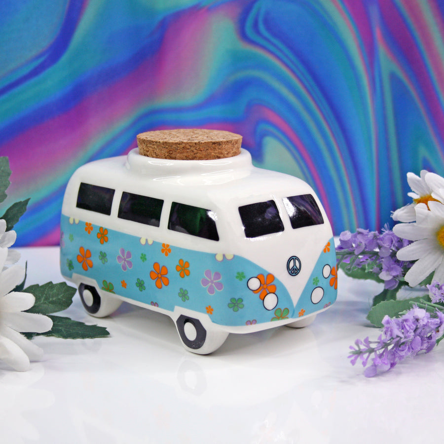 This fun and adorable novelty adult gift features the shape of a bus with a colorful hippie style flower or tie-dye design on the side. On top of the bus is an opening that seals with a cork lid. Use the jar to stash coffee, teas, spices, herbs, and medical herbs. The cork lid keeps contents fresh and sealed for months.