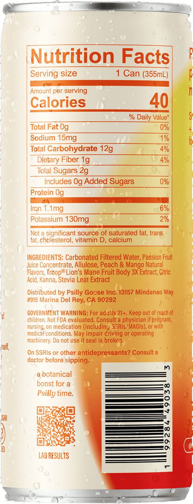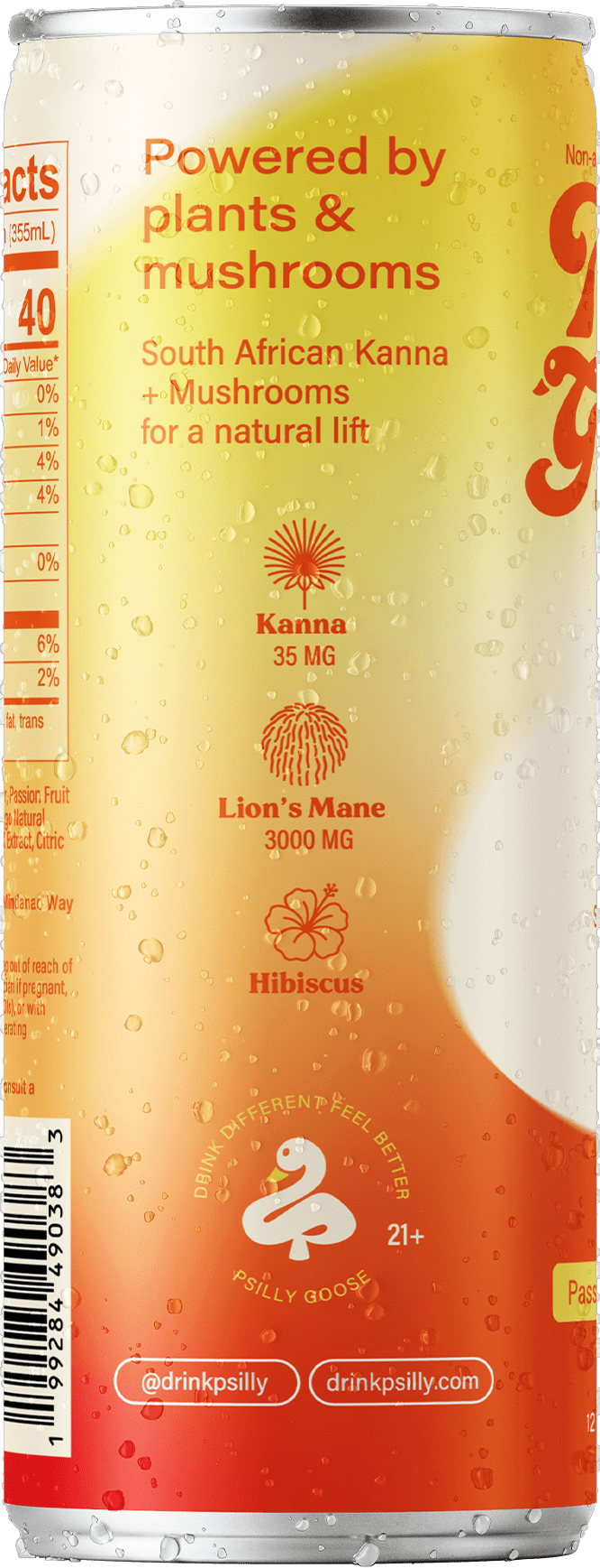 Your new favorite drink built for connection, fun and flow. Juicy passionfruit and mango meet Lion’s Mane and Kanna for an uplifting buzz that keeps energy flowing and leaves you feeling open and light.